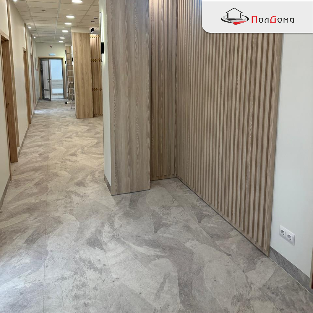 Больница получила практичное, долговечное и эстетичное покрытие, которое выдерживает ежедневный поток пациентов и персонала. Пол выглядит современно и опрятно, легко моется, а ровная геометрия укладки подчёркивает аккуратность пространства.