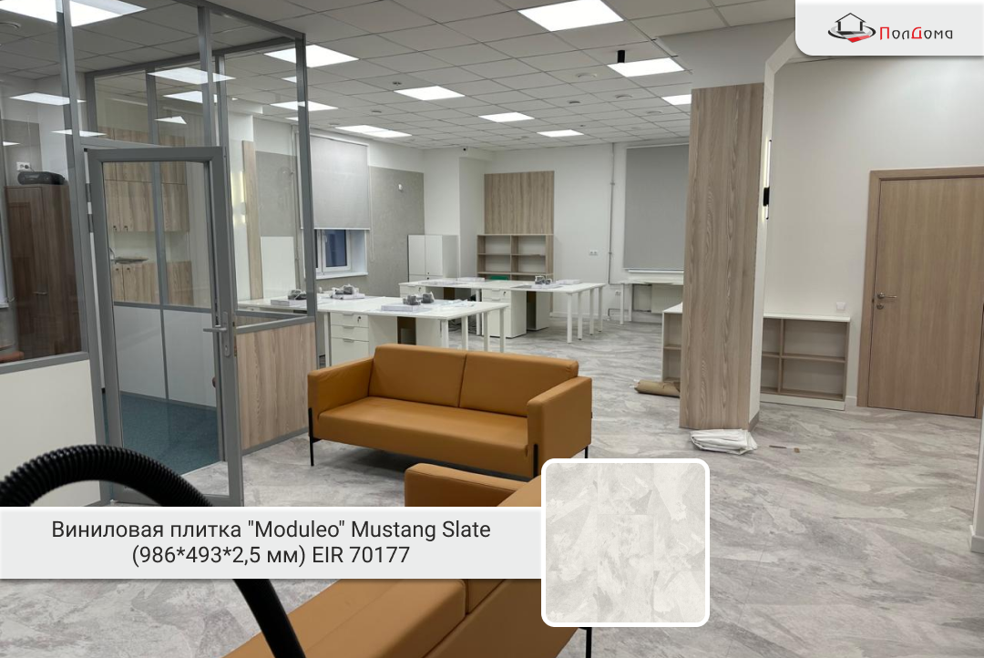 Для отделки использована клеевая виниловая плитка Moduleo Mustang Slate — коллекция с фактурой натурального сланца. Матовая поверхность уменьшает видимость следов и создаёт благородный «каменный» эффект. Клеевой способ фиксации обеспечивает стабильность размеров и аккуратные стыки.