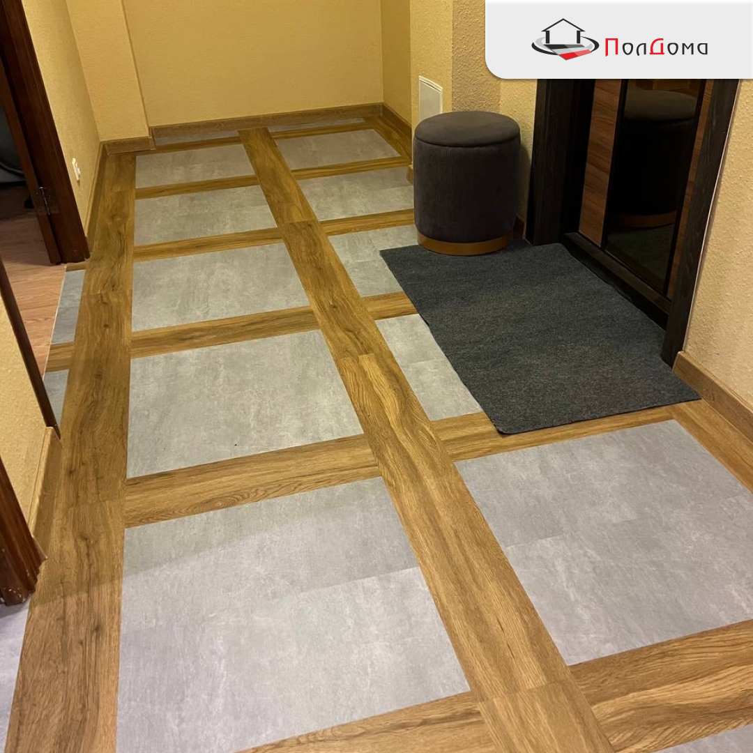 Квартира находится в новостройке, и изначально в коридоре уже был уложен ламинат. Однако владельцы хотели получить более надёжное и влагостойкое решение, которое выдержит ежедневные нагрузки, грязь с улицы и случайные лужицы от дождя на обуви. Выбор пал на современную коммерческую LVT плитку — идеальный вариант для зоны с высокой проходимостью.